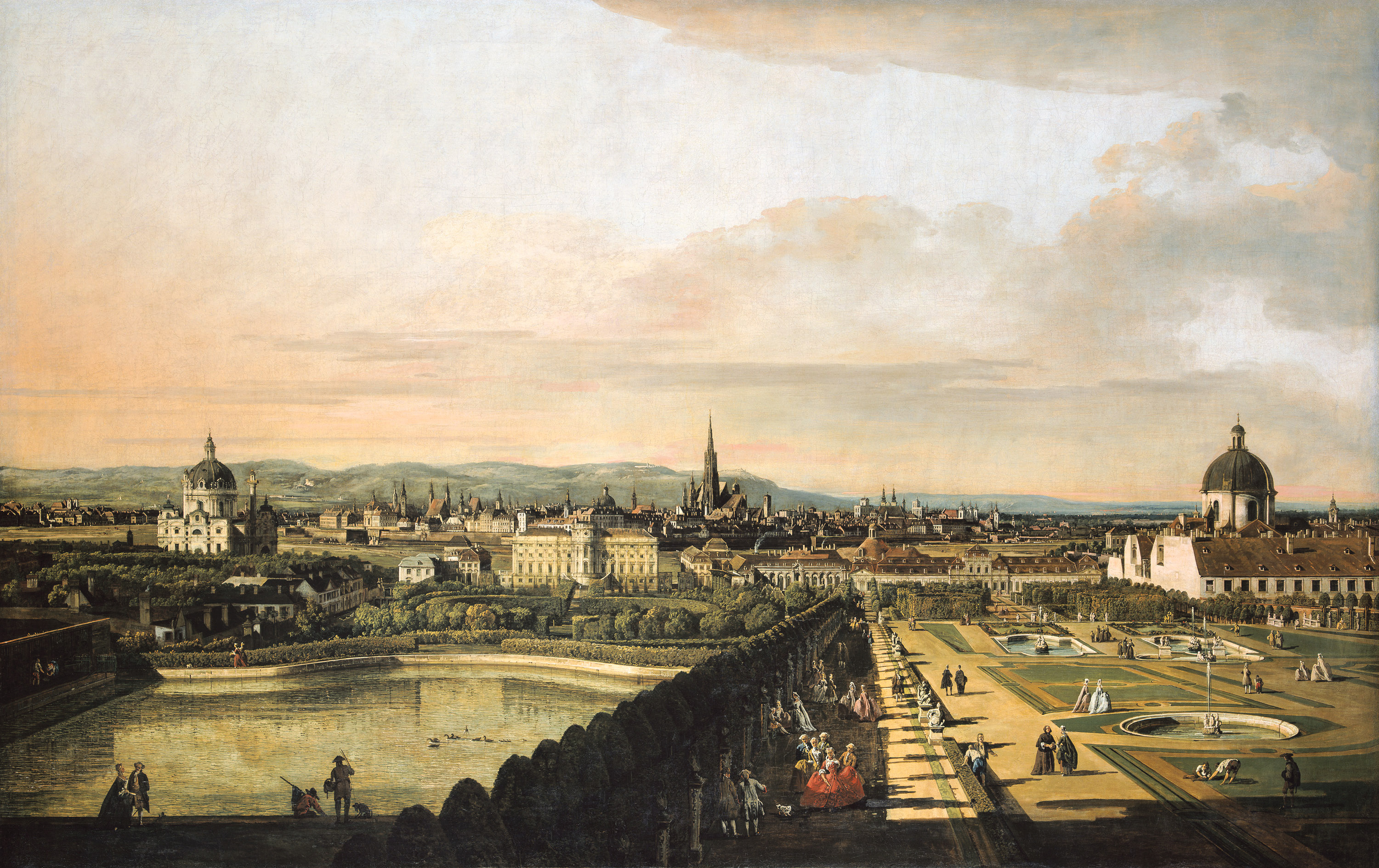Bernardo Bellotto, genannt Canaletto, hingegen fand 1747 eine Stelle als sächsischer Hofmaler in Dresden. Seine ikonischen Veduten von Elbflorenz dienen bis heute dem Stadtmarketing, die Ansicht der Altstadt vom anderen Ufer des Flusses heißt bis in die Gegenwart „Canaletto-Blick“. Er inszenierte die Elbe als eine Art sächsischen Canale Grande. Unterbrochen von ertragreichen Aufenthalten in Wien und München wirkte Bellotto 20 Jahre in der sächsischen Residenzstadt. Im Mittelpunkt der Ausstellung steht die Fülle Wiener Darstellungen, von Schloss Schönbrunn, dem Park Belvedere mit der vom Stephansdom überragten Altstadt im Hintergrund – dem Wiener „Canaletto-Blick“ – sowie zahlreicher weiterer Motive in der Kaiserstadt und ihrer Umgebung. Bellotto entwickelte zunehmend ein Interesse sowohl für Genreszenen als auch für die Landschaftsmalerei. 1767 übersiedelte er von Dresden nach Warschau, wo er in den Dienst des kunstsinnigen polnischen Königs Stanislaus Poniatowski trat und bis zu seinem Lebensende wirkte. wr
